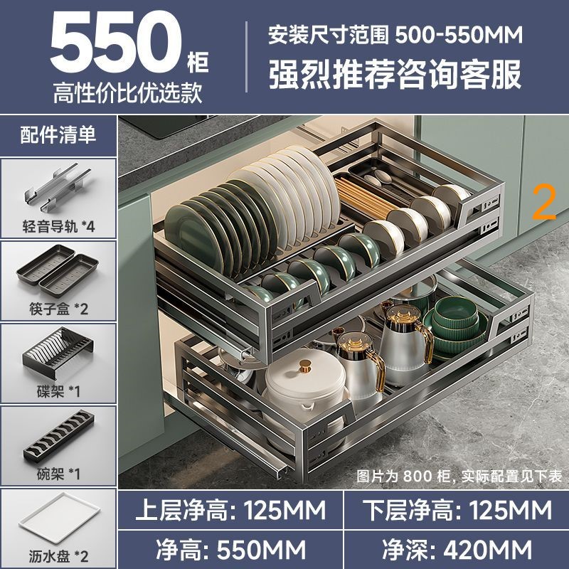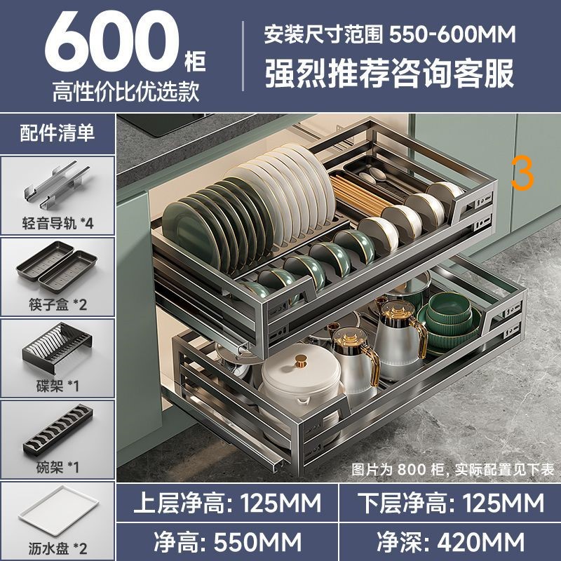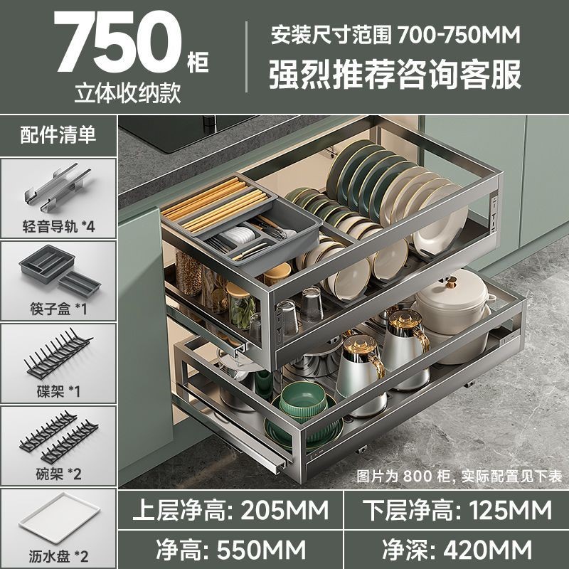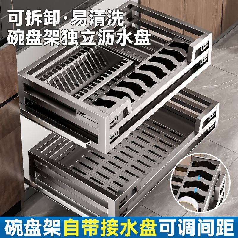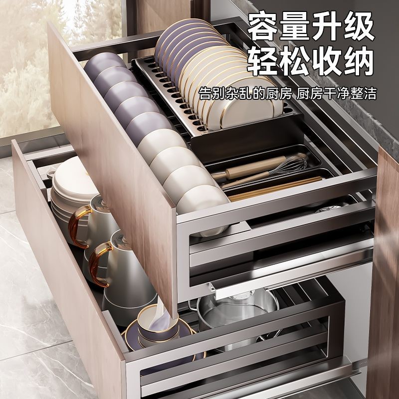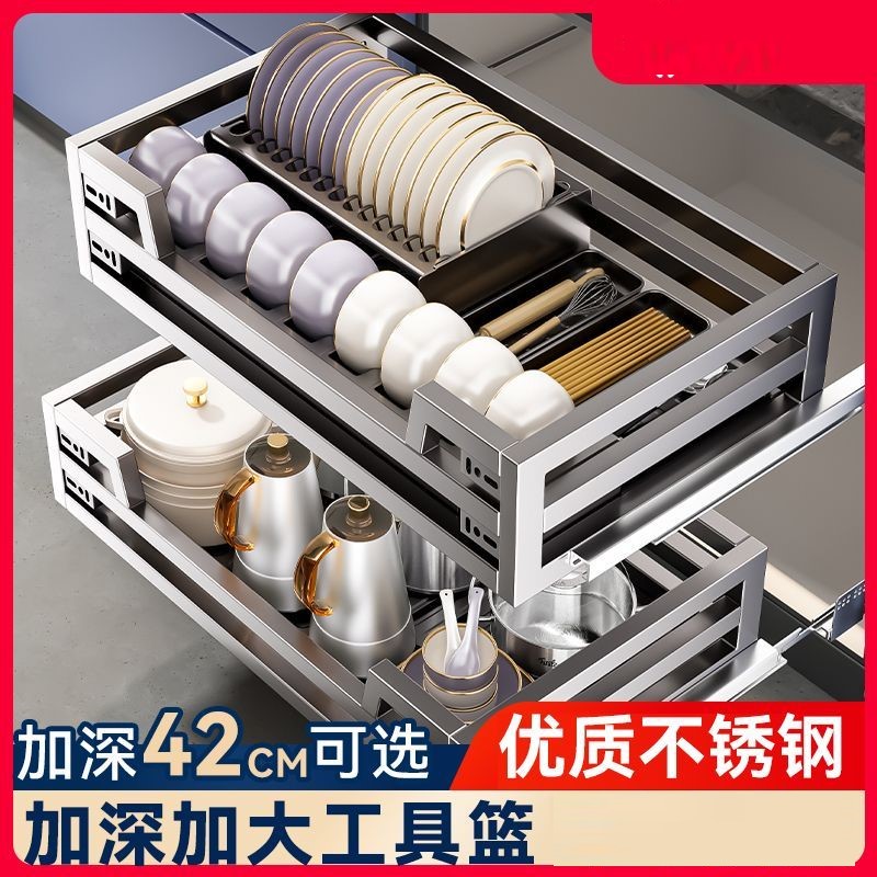 304不銹碳鋼拉籃廚房抽屜式碗籃櫥櫃雙層開門式內置收納碗碟廚具拉籃廚具碗籃