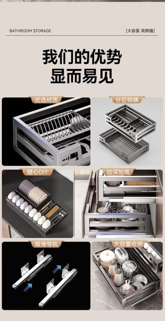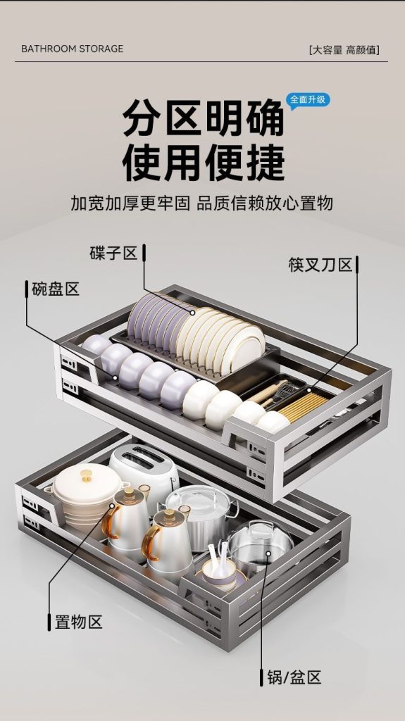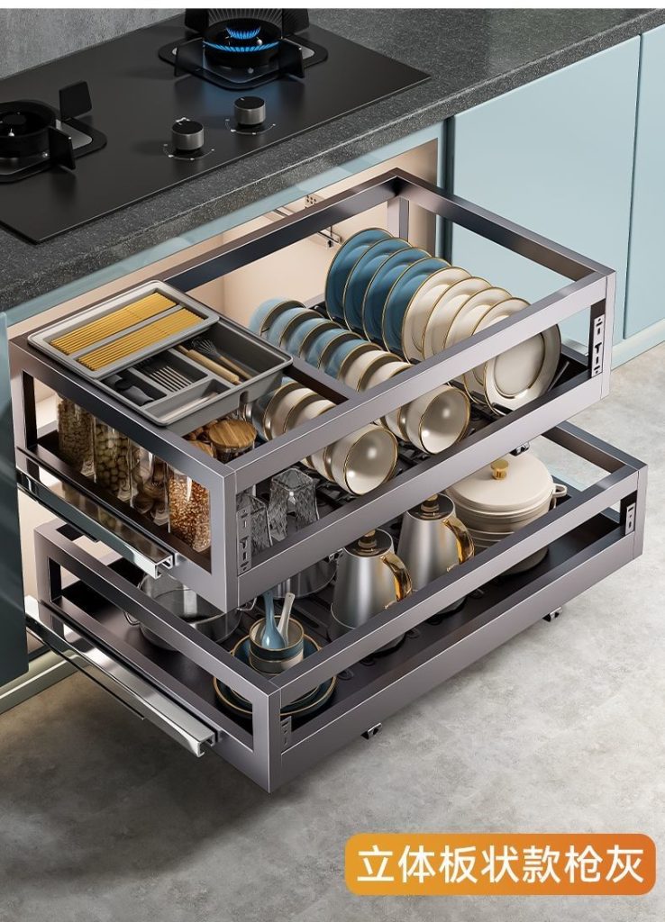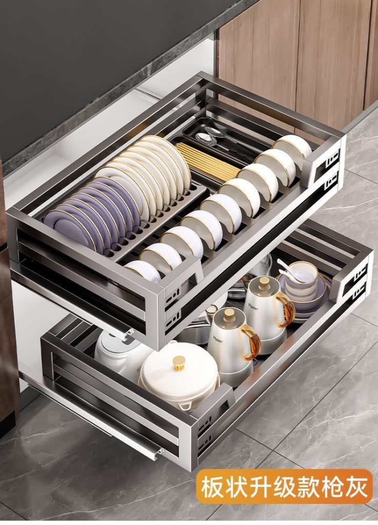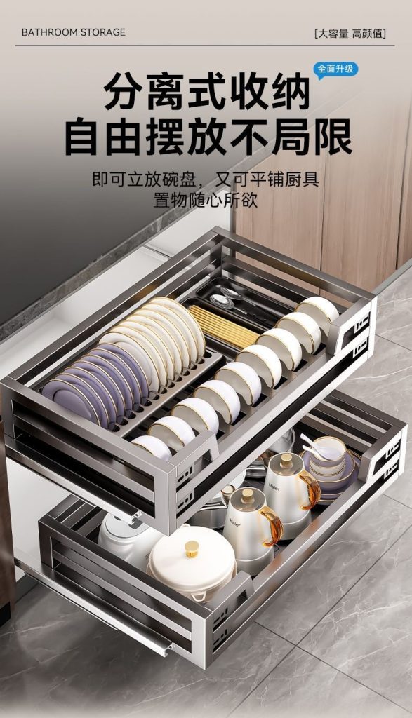 304不銹碳鋼拉籃廚房抽屜式碗籃櫥櫃雙層開門式內置收納碗碟廚具拉籃廚具碗籃
